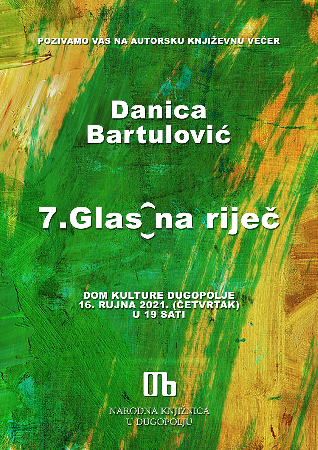 Dragi naši, već sedmu godinu zaredom pripremamo tradicionalnu kulturnu večer uoči blagdana Sv. Mihovila i Sv. Jeronima, te Dana općine Dugopolje. Ovogodišnja 7. Glas na riječ održava se 16. rujna i ugostit će književnicu Danicu Bartulović, autoricu brojnih knjiga duhovne, zavičajne i haiku poezije. Književno predstavljanje počinje u 19 sati, a zbog epidemioloških mjera održat će se u Domu kulture.