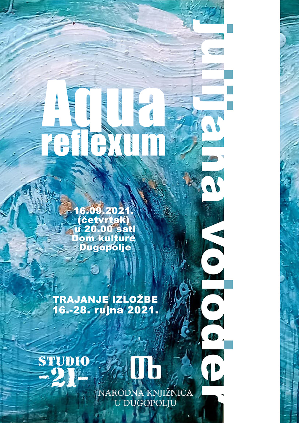 Kulturna večer nastavit će se otvorenjem izložbe “Aqua reflexum” akademske umjetnice Julijane Voloder, u 20 sati. Izložbu ćete moći razgledati do 28. rujna.
